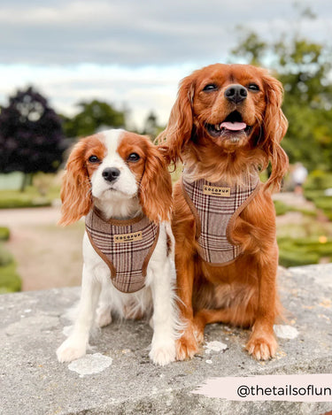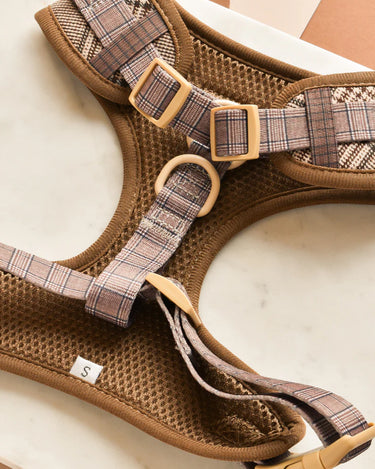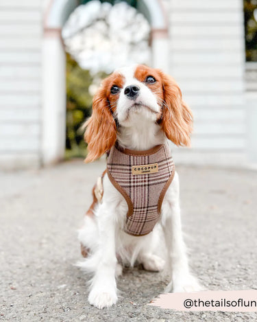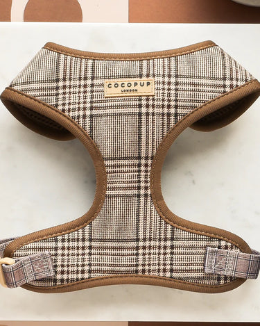 Add a touch of country charm to your pup's walk with Cocopups Pup Plaid Adjustable Neck Harness. Featuring a trendy tweed design and a classic tartan pattern in chocolate brown, this harness keeps your dog safe with its safety feature lock. Perfect for a stylish stroll!